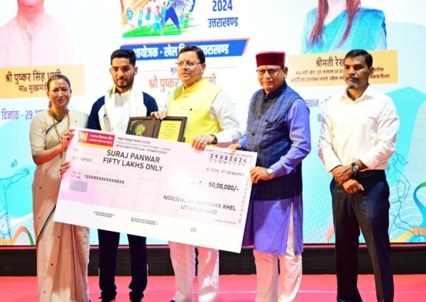 देहरादून : मुख्यमंत्री पुष्कर सिंह धामी ने गुरुवार को बहुउद्देशीय क्रीडा भवन, परेड ग्राउंड देहरादून में राष्ट्रीय खेल दिवस के अवसर पर आयोजित कार्यक्रम में सभी को खेल दिवस की शुभकामना दी तथा हॉकी के जादूगर  के चित्र पर माल्यार्पण कर उन्हें श्रद्धांजलि अर्पित की। इस अवसर पर मुख्यमंत्री ने पेरिस ओलंपिक 2024 में प्रतिभाग करने वाले उत्तराखंड के 4 खिलाड़ियों ( लक्ष्य सेन,  परमजीत सिंह, सूरज पंवार, अंकिता ध्यानी ) को 50 – 50 लाख की धनराशि के चेक प्रदान किये।